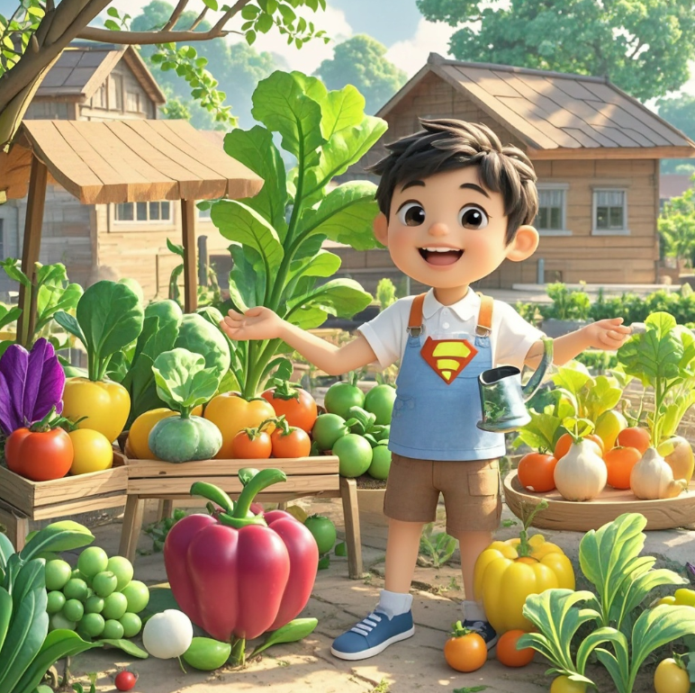 在一个小村庄里,有一个名叫小刚的男孩。他热爱种植蔬菜,并且有一个特别的梦想:种植出超级蔬菜,让人们健康快乐。