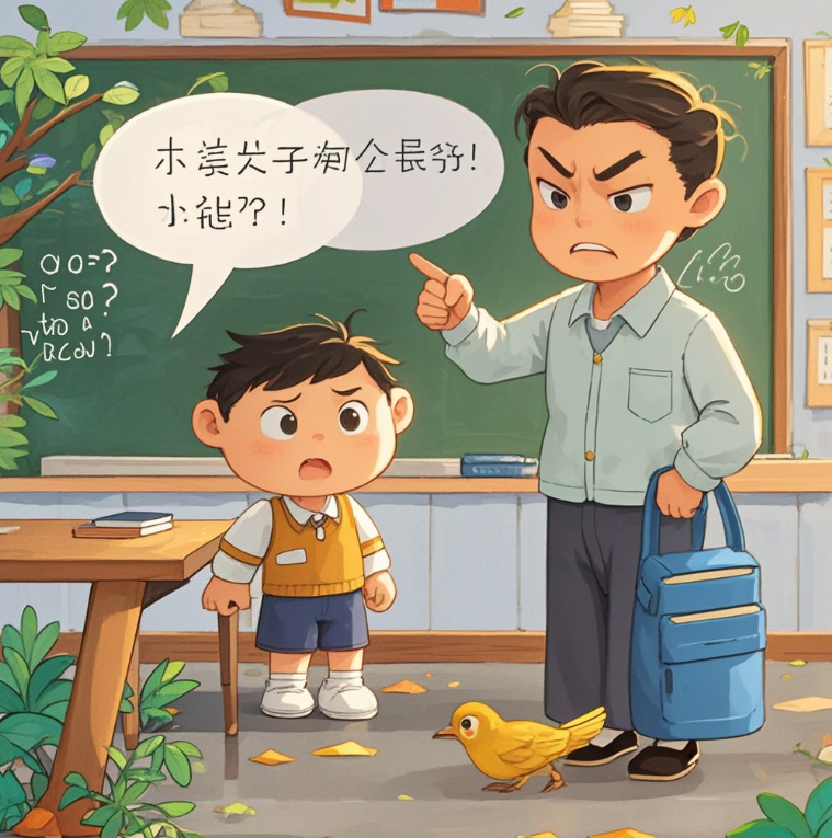 小明撒了一个小谎:“老师,我在路上看到一只小鸟掉在地上,就停下来把它放回了树上。”