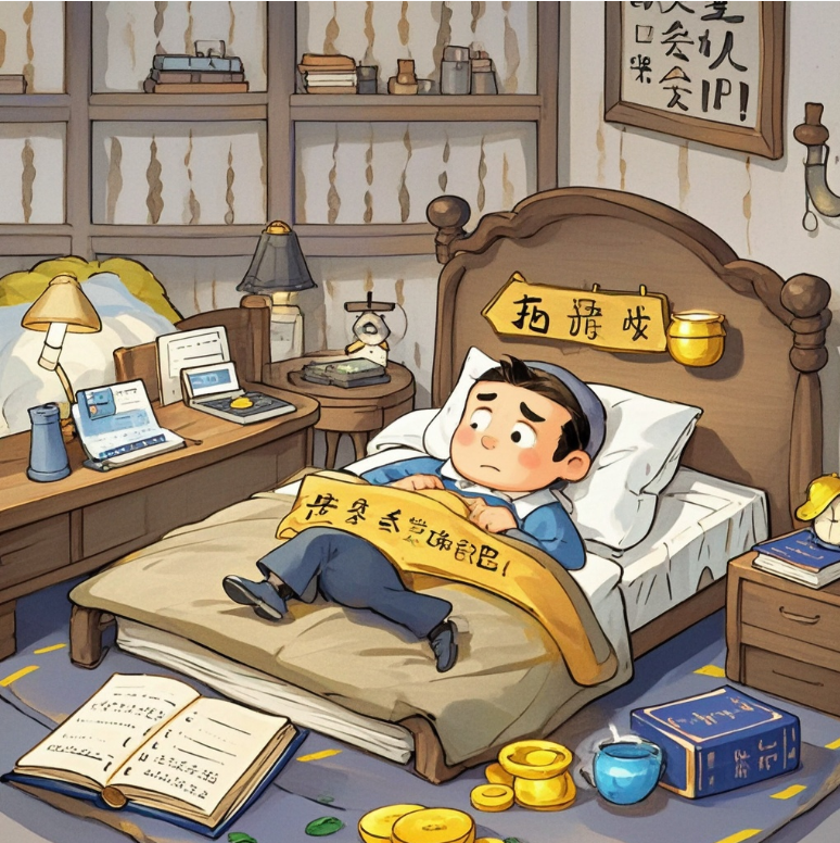 阿贵失望地回到家,继续躺在床上。突然,他想到一个主意,决定写一本关于如何懒惰的书。于是,他开始勤奋地写作,每天研究如何更好地懒惰。