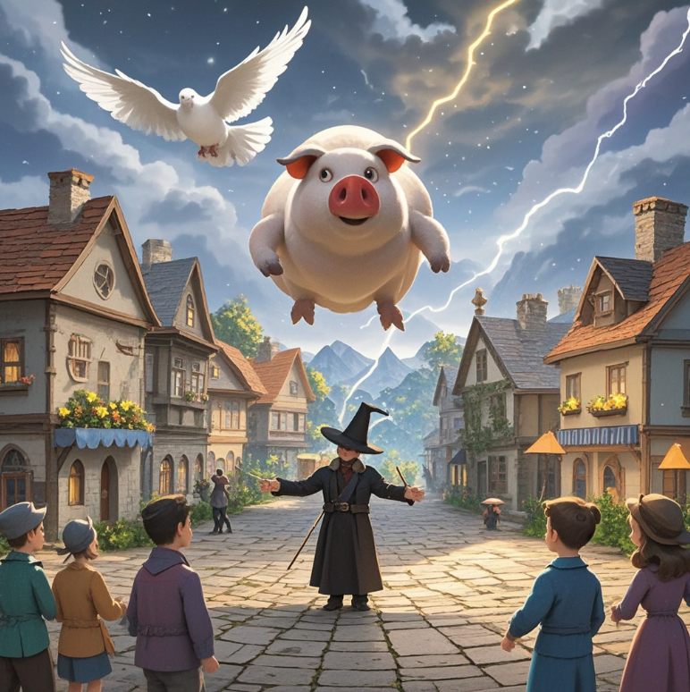 魔法师站在镇上的广场上,让大家围成一圈。他挥舞着手中的魔杖,口中念念有词。突然,他指向天空,一道闪电划过,接着,一只巨大的猪出现在空中。
