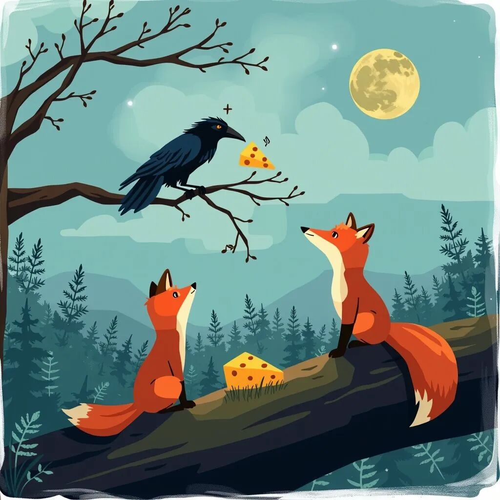 有一天,乌鸦找到了一根奶酪,高兴地飞到树枝上。狐狸看到了,心生一计,决定骗乌鸦把奶酪给自己。狐狸对乌鸦说:“亲爱的乌鸦,你的歌声真美妙,能唱首歌给我听吗?”乌鸦为了展示自己的歌唱才华,张嘴唱歌,结果奶酪掉落,被狐狸捡走了。乌鸦觉悟过来,不禁自嘲地笑了。