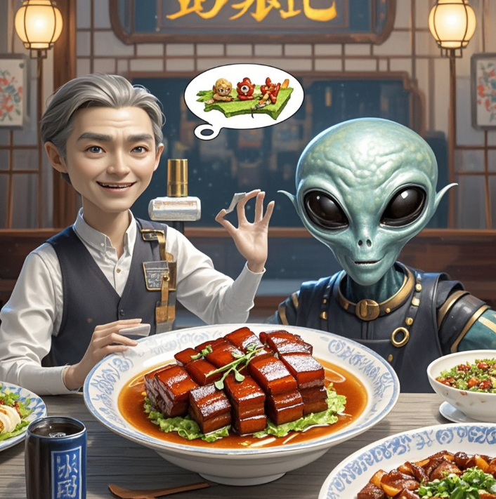 一天,外星人老李来到地球,降落在了中国。他听说中国的美食非常丰富,于是决定去尝尝。老李找到了一家饭店,点了一份红烧肉。然而,他发现红烧肉里有头发,于是找服务员理论。服务员抱歉地说:“先生,我国的头发也是红烧肉的一部分,这是特色。”外星人老李瞪大了眼睛,不禁大笑起来。