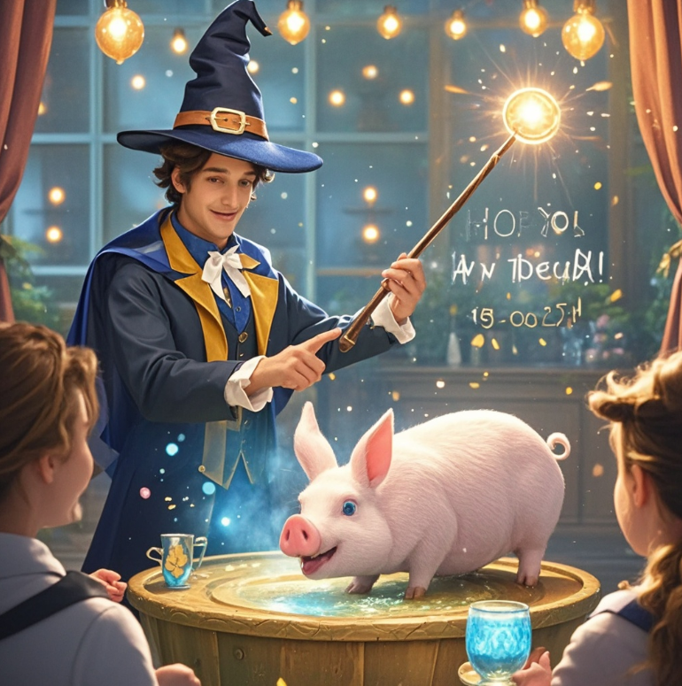 一位魔法师在一次表演中,打算变出一只兔子。他挥动手中的魔杖,口中念念有词。然而,魔法失误,变出来了一只猪。观众们哄堂大笑,魔法师尴尬地笑了笑,解释说:“这是猪年特别版。”