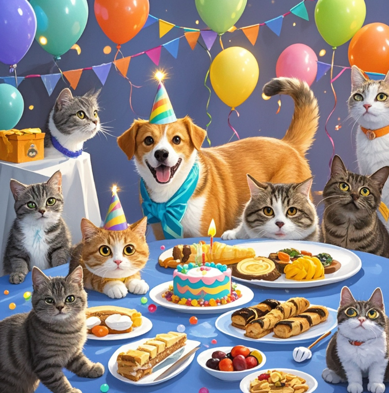 一只猫咪过生日,主人决定给它举办一个生日派对。邀请了众多猫咪好友前来参加。派对上,猫咪们尽情玩耍,享用美食。突然,一只狗狗闯了进来,猫咪们吓得躲在角落里。狗狗看着满地的美食,高兴地说:“猫咪们的派对真有趣,我都忍不住想参加!”猫咪们听后,不禁笑了起来。