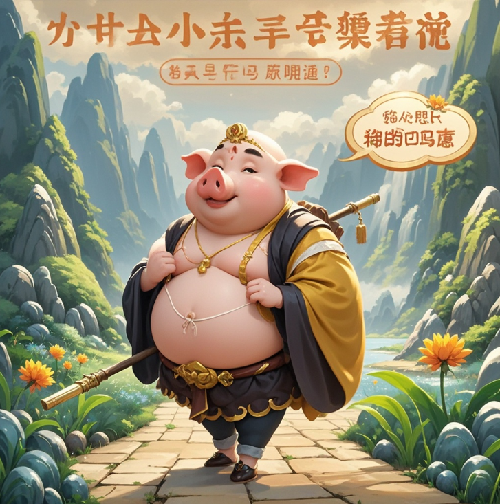 猪八戒在取经路上,因为贪吃懒做,体重不断增加。一天,他看到一则广告说:“瘦身神丹,吃一颗立刻变瘦!”猪八戒心动了,买了一颗试一试。结果,他变成了一个瘦弱的“人”。当他想变回原来的样子时,却发现神丹过期了。无奈,他只好背着瘦弱的身体继续取经。