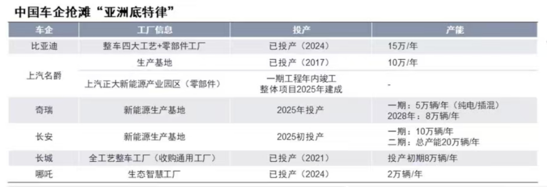 今年7月,比亚迪和埃安的泰国工厂先后竣工投产。目前,上汽名爵、长城、长安、比亚迪、奇瑞、哪吒等中国车企已在泰国建厂,使其成为中国车企产能出海的主要目的地,不需要多长时间,中国将取代日本,在泰国拥有最多的汽车工厂。
