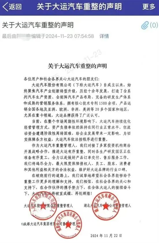 声明称,流动资金遭遇阶段性周转困难,给企业发展带来一定影响,为切实保障各方利益,大运汽车依法按程序进行重整。
