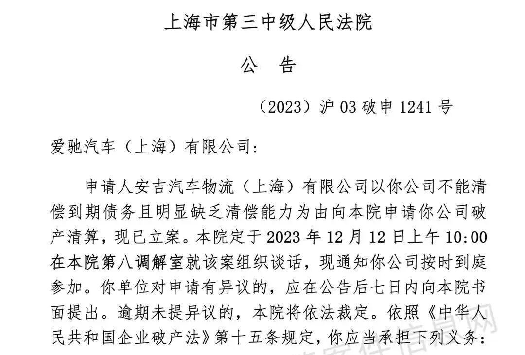 作为爱驰汽车有限公司的全资子公司,上海亿维新能汽车研发有限公司(曾用名为爱驰汽车(上海)有限公司)已被申请破产。2023年11月30日,安吉汽车物流(上海)有限公司以爱驰汽车(上海)有限公司不能清偿到期债务且明显缺乏清偿能力为由,向上海市第三中级人民法院申请破产清算。