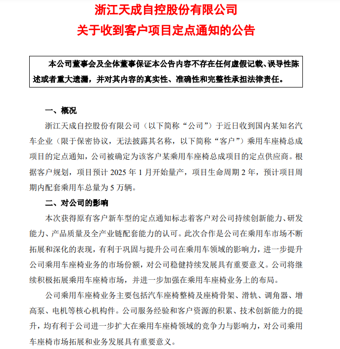 公告里提到本次定点是原有客户的新车型,已知天成和上汽荣威、名爵、奇瑞、比亚迪、东风、北汽、江淮、吉利、吉祥、蔚来等乘用车主机厂均有业务来往,范围还是比较大。