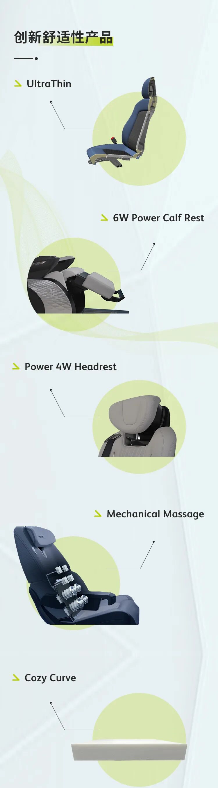 结构比传统座椅紧凑,后排乘客可以将脚舒适地放在前排座椅下。无论是静态或动态,都能让乘客感受到非凡的舒适感。