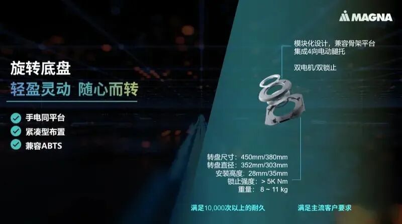 该底盘遵循模块化构建原则,既支持手动操作也兼容电动控制,可轻松实现0至270°的平滑旋转,并在多个角度设有锁定机制,确保座椅稳固不晃动。