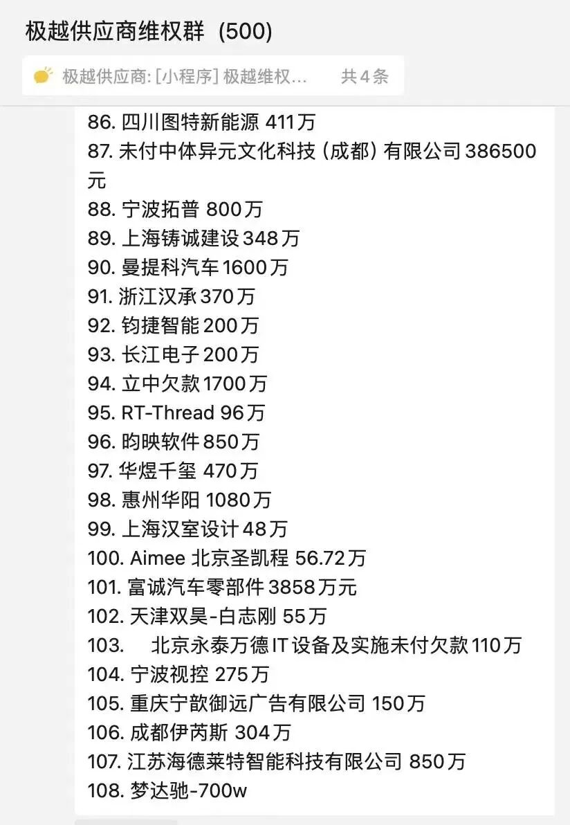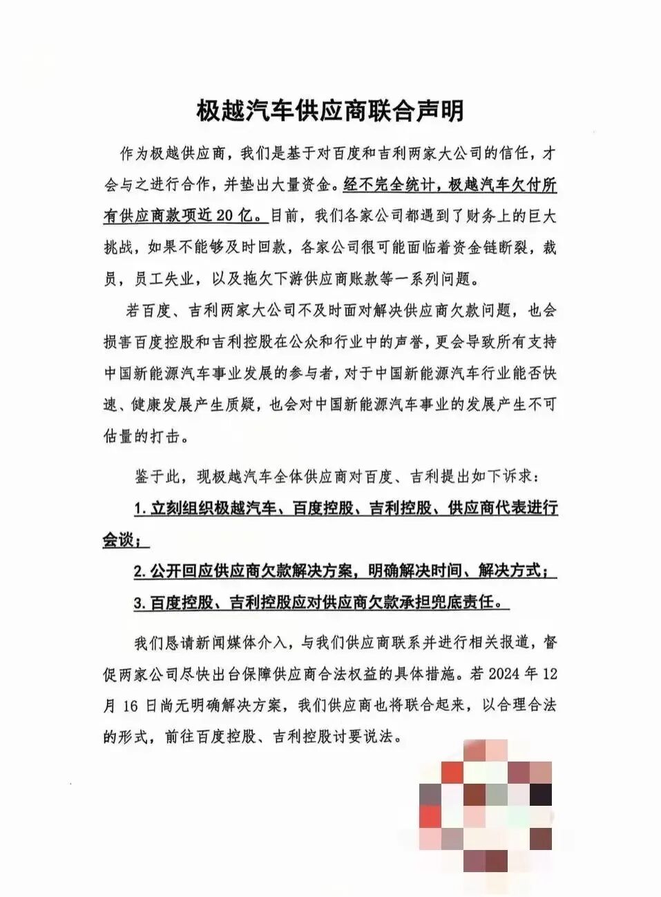 作为极越供应商,我们是基于对百度和吉利两家大公司的信任,才会与之进行合作,并垫出大量资金。经不完全统计,极越汽车欠付所有供应商款项近20亿。目前,我们各家公司都遇到了财务上的巨大挑战,如果不能够及时回款,各家公司很可能面临着资金链断裂,裁员,员工失业,以及拖欠下游供应商账款等一系列问题。