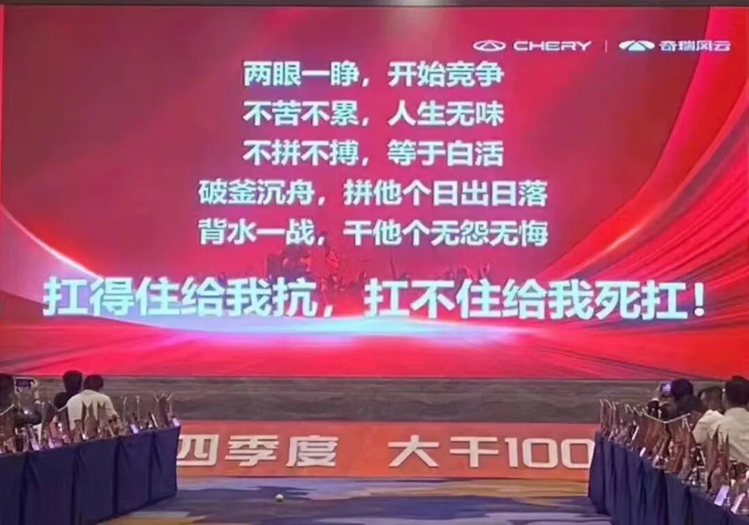 无独有偶,本周初网络上也流传了疑似奇瑞汽车大干100天的第四季度动员大会图片: