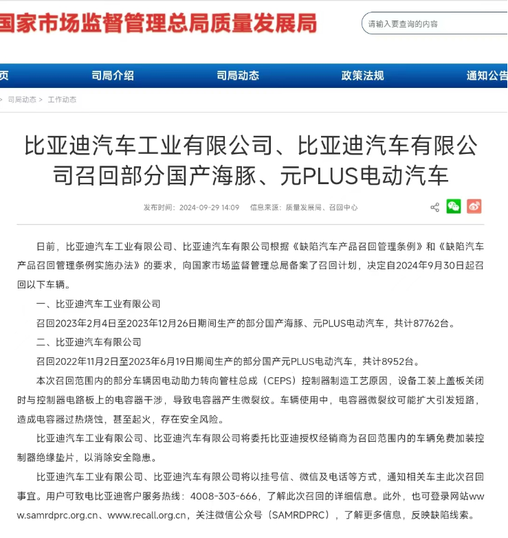 就在2小时前,据国家市场监督管理总局消息,比亚迪将自2024年9月30日起,召回部分国产海豚和元PLUS电动汽车,共计9.67万台。