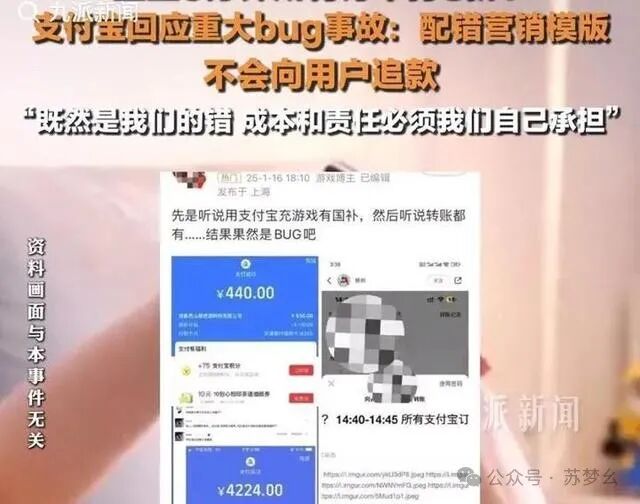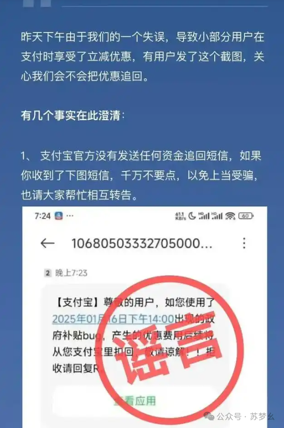 1月16日下午,多位支付宝用户在社交媒体发布订单支付页面截图称,支付宝在14:40—14:45时间段内出现Bug,通过支付宝进行个人转账、信用卡支付、缴费等操作时,均在订单支付时提示“政府补贴”,因此打了八折,即减免20%。