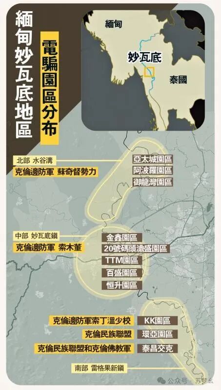 目前大众更为熟悉的妙瓦底KK园区,是在水沟谷亚太城之后崛起的新电诈园区,是由苏奇督上校的“左膀”苏丁温少校与来自中国的不法分子合作开设的,而苏奇督的“右臂”苏墨东少校也与其他不法分子进行着电诈合作。
