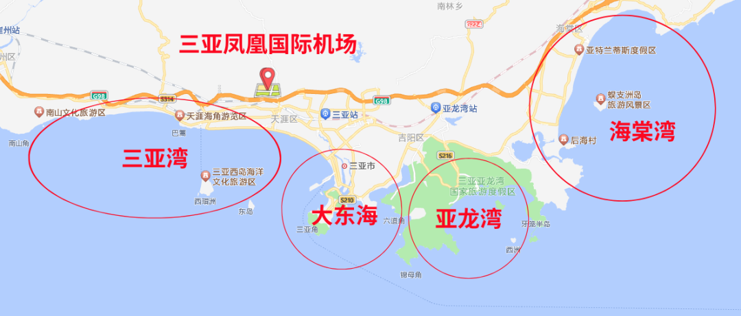 其中三亚湾和大东海在市区,亚龙湾和海棠湾偏一些,三亚凤凰国际机场在三亚湾。