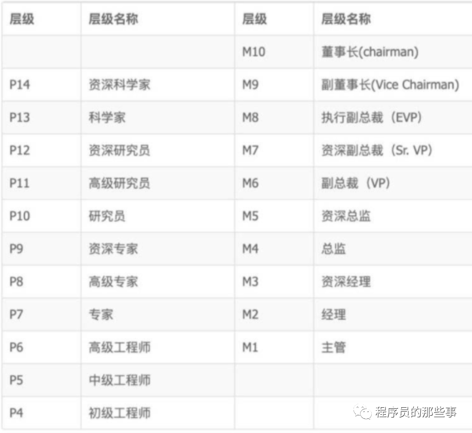 阿里有着一套独特的职级体系,采用的是 P(profession)和 M(Management)两条职级体系,其中,“P”代表专业序列,如程序员、产品经理、运营、市场等大多员工都在该序列。“M”则为管理序列,需要具备管理团队的经验和能力。