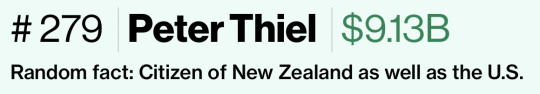 截至目前,Thiel的净资产估计为91.3亿美元,在彭博社亿万富翁目录中排名第279。