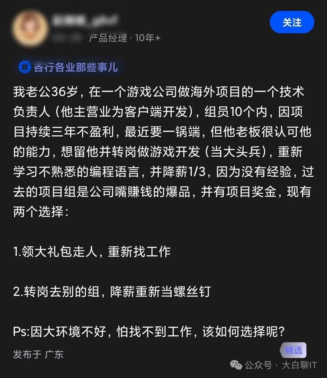 有一个产品经理分享了自己老公的现状:她老公36岁,在一个游戏公司做海外项目的一个技术负责人(他主营业为客户端开发),组员小于10个人,因项目持续三年不盈利,最近要一锅端,但他老板很认可他的能力,想留他并转岗做游戏开发(当大头兵),重新学习不熟悉的编程语言,还要降薪1/3,因为没有游戏开发经验,过去的项目组是公司最赚钱的爆品,并有项目奖金,现有两个选择: