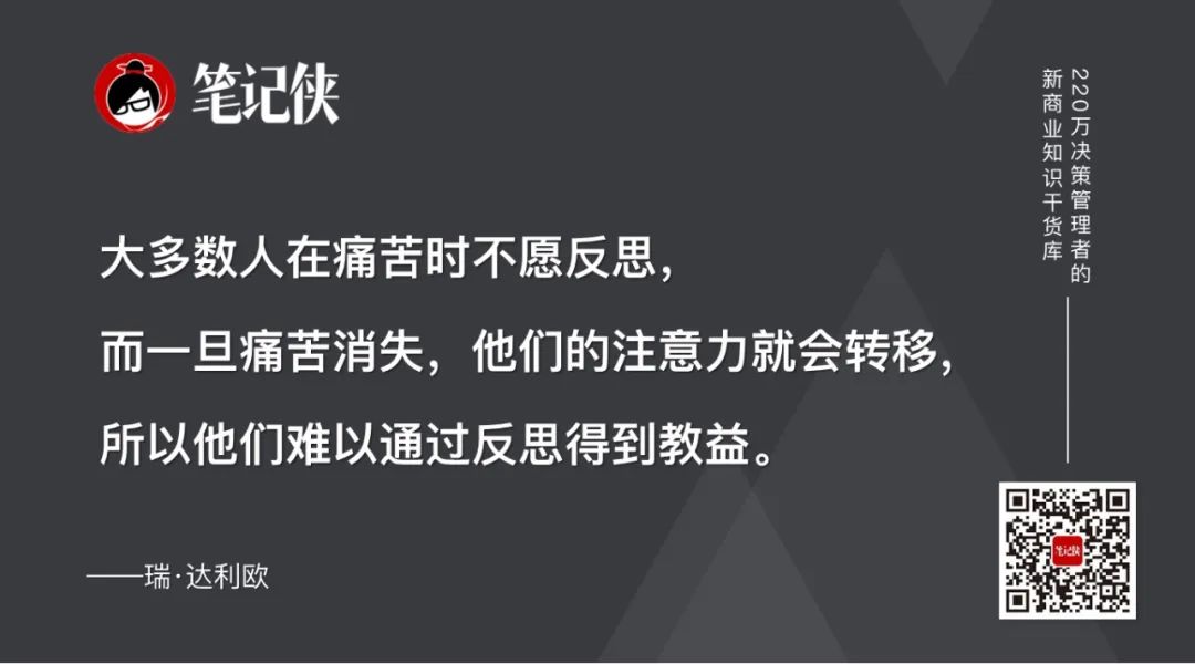 但大多数人在痛苦时不愿反思,而一旦痛苦消失,他们的注意力就会转移,所以他们难以通过反思得到教益。如果你在痛苦时就能好好反思,你就能够快速地学习和进化。