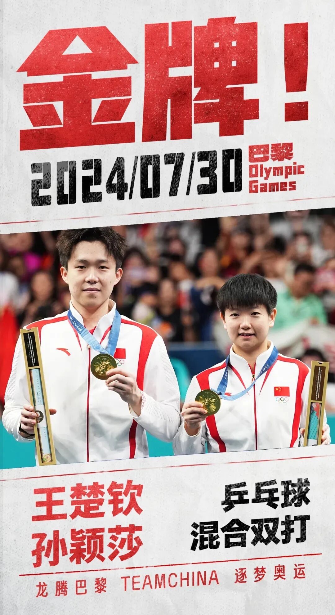2024年巴黎奥运会乒乓球混合双打决赛,中国组合孙颖莎/王楚钦以4-2战胜朝鲜“神秘之师”,夺得金牌。