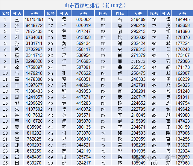附:山东百家姓排名(前100名)