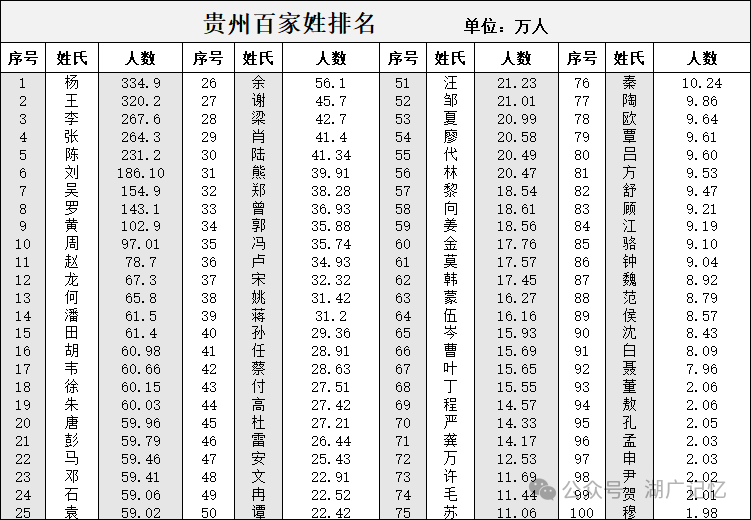 在贵州,杨、王、李、张、陈等姓氏,是境内人口大姓,其人口均超过200万人。境内一些不常见的姓氏,如敖姓、穆姓等在贵州也有2万多人。下面我们来说说,贵州的五个大姓。
