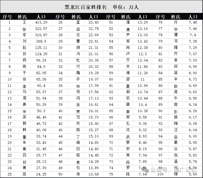 在黑龙江,王、李、刘、孙、张、赵等姓氏是境内人口较多的大姓,这些姓氏人口均超过120万人。其中,王姓人口最多有413万人。其次,张姓有322万人,李姓有316万人。再次,刘姓有268万人。
