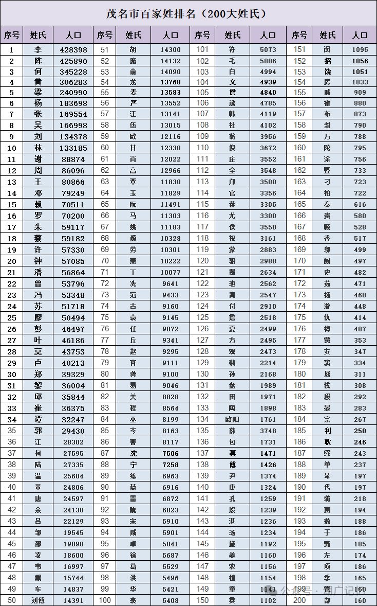 各位朋友,说说看你的姓氏是从哪里迁到茂名市的,看看茂名市百家姓排名表你的姓氏上榜了吗?