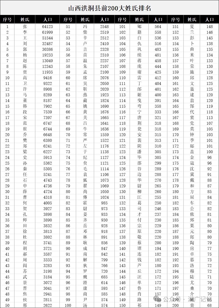 1990年,山西人口普查时,洪洞县姓氏多达640多个。张姓、赵姓、李姓、杨姓、王姓、郭姓、刘姓是洪洞县人口较多的大姓,其人口均超过13000人。