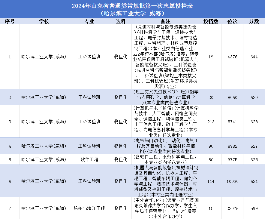 以下是2024年山东省普通类常规批第一次投档表情况,小编筛选出哈尔滨工业大学的相关数据,供考生及家长进行参考。