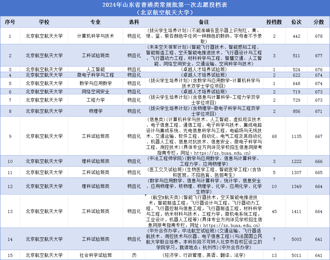 以下是2024年山东省普通类常规批第一次投档表情况,小编筛选出北京航空航天大学的相关数据,供考生及家长进行参考: