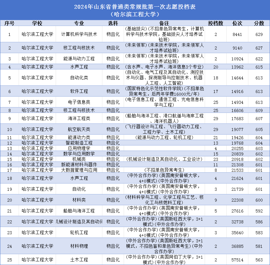 以下是2024年山东省普通类常规批第一次投档表情况,小编筛选出哈尔滨工程大学的相关数据,供考生及家长进行参考。