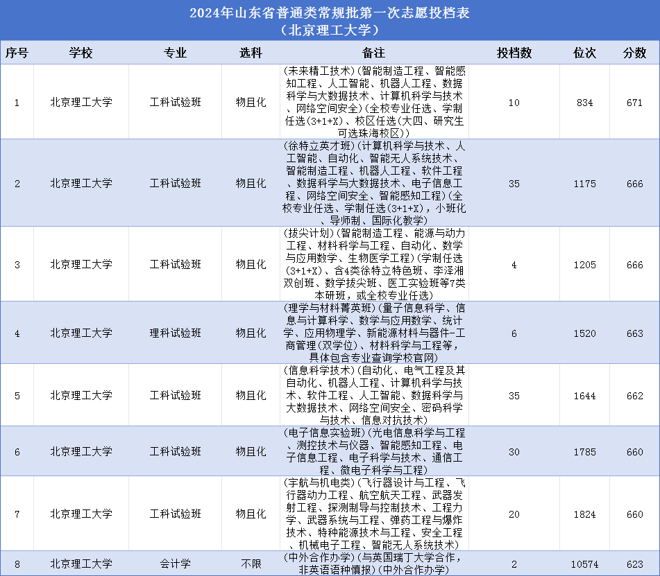 通过表格我们可以看到,北京理工大学2024年普通类常规批第1次志愿投档整体位于800至10000位次区间。其中,工科试验班(未来精工技术)在山东投档计划数10人,投档最低位次为834位次,投档最低分为671分。