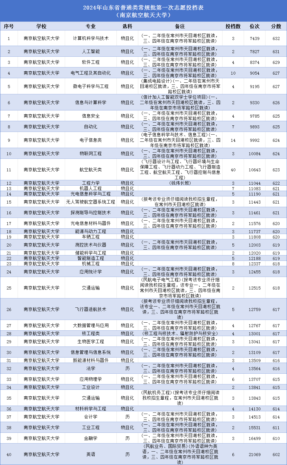 以下是2024年山东省普通类常规批第一次投档表情况,小编筛选出南京航空航天大学的相关数据,供考生及家长进行参考。