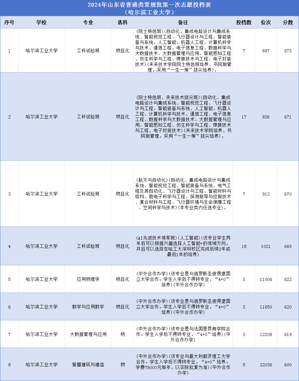 通过表格我们可以看到,哈尔滨工业大学2024年普通类常规批第1次志愿投档整体位于600至22000位次区间。其中,工科试验班(院士特色班)在山东投档计划数位7人,投档最低位次为687位次。