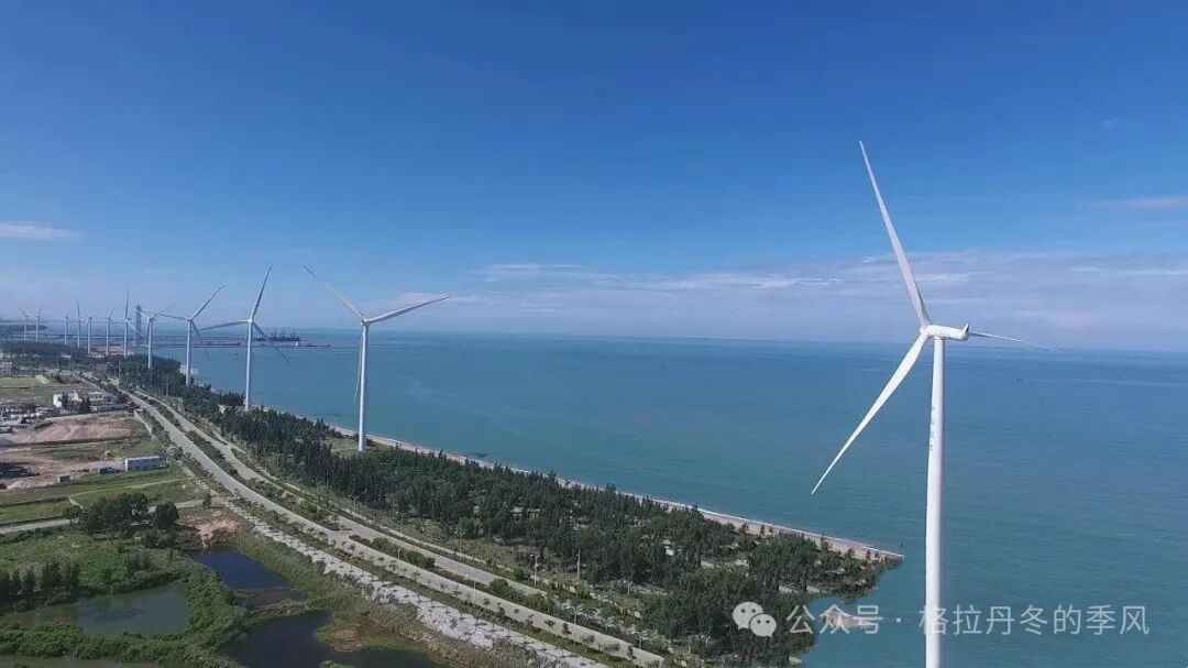 鱼鳞洲因濒临北部湾,因此这里的风能资源异常丰富,海滩上耸立着18座巨大的风车。