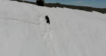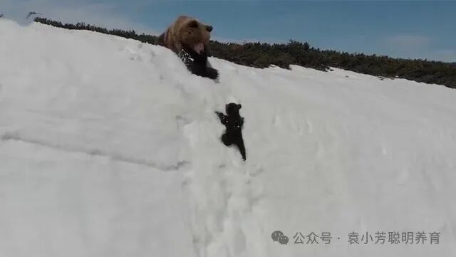 这个视频拍摄了一只小熊跟随熊妈妈从一座雪山谷向山顶爬去的全过程。