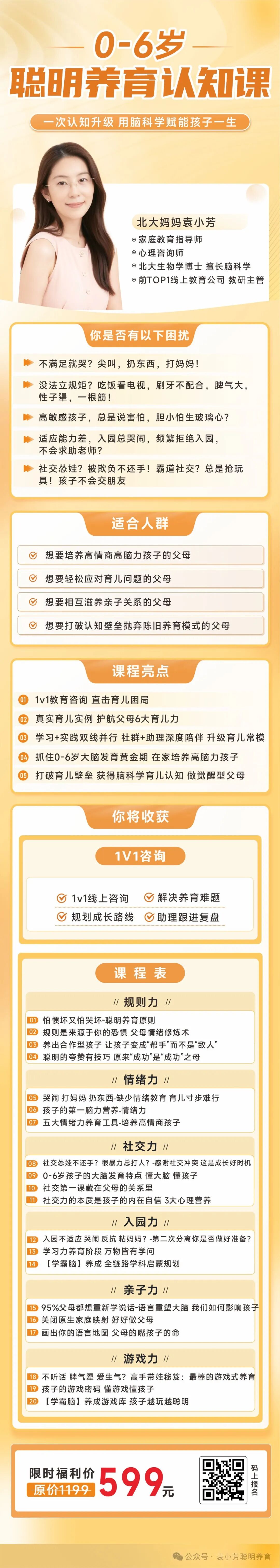 上面这部分能力的培养在我的《0-6岁聪明养育认知课》中均有深入的讲解,此外课程附带2个月的1v1咨询答疑,有兴趣可以后台私信我。