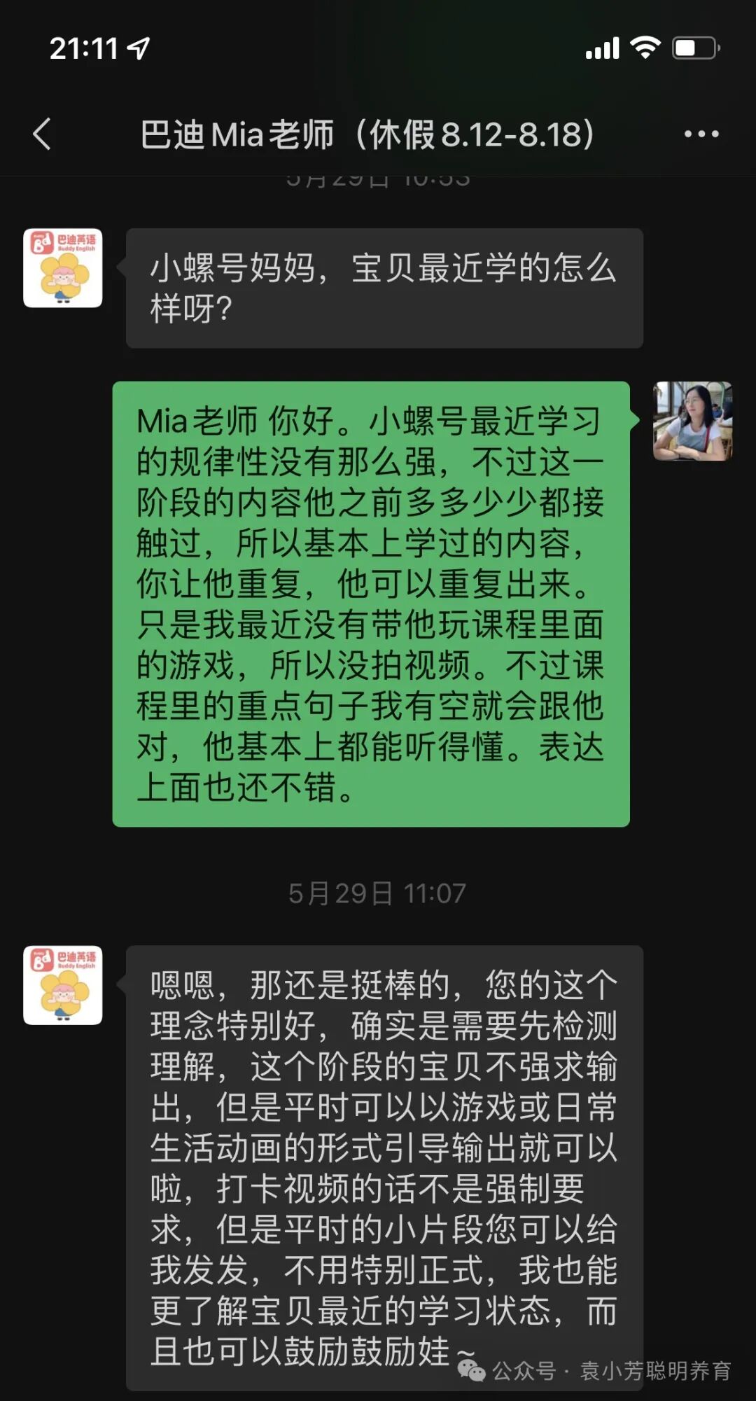每一个进入巴迪英语学习的父母都会得到老师的1对1帮助,有音频、有视频。
