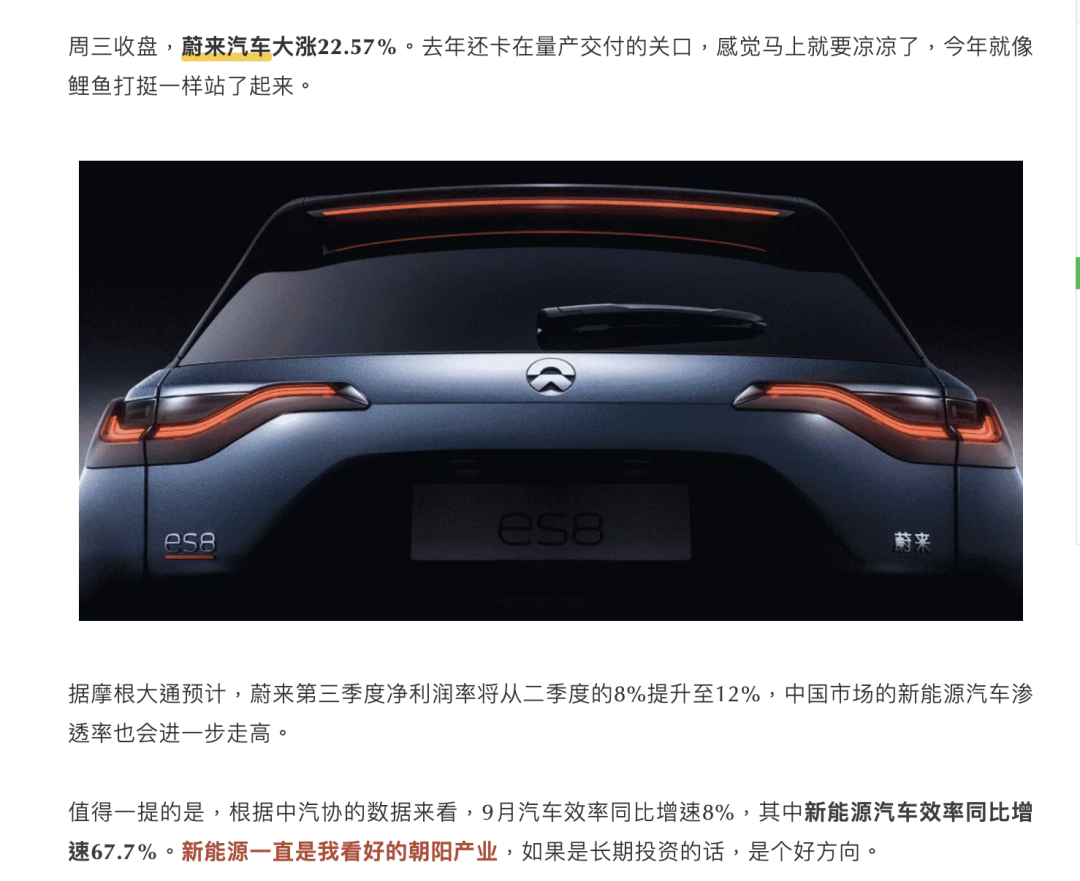 后来咱们也两次提到了新能源汽车,第一次是蔚来刚刚起势的时候: