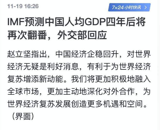 今天IMF还发布预测,说四年后中国GDP将再次翻番,就是从2019年的1万美元翻到2万美元。给大家一个参考,石油大佬沙特人均GDP2.18万美元,韩国3.22万美元,日本4.13万美元,美国和新加坡6.5万美元。