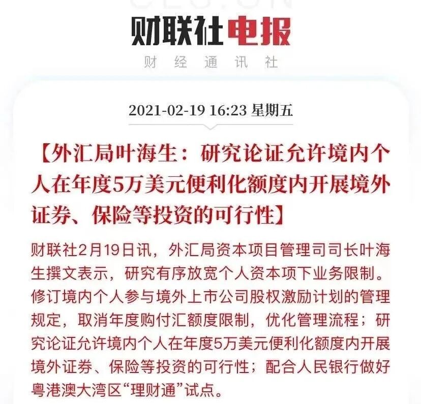 上周,外汇局资本项目管理司司长写文章说,正在研究允许境内个人在境外投资证券、保险,限制额是5万美金。