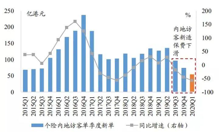 香港个人寿险内地访客单季度新单保费, 资料来源《香港保险业监管局》,可以看出2016Q4年达到了峰值,与当年10月末银联出台的暂停缴纳香港保险保费业务政策有关