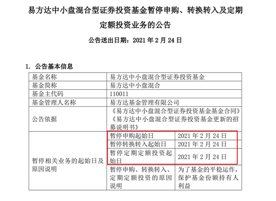 易方达发布公告,旗下张坤管理的易方达中小盘在2月24日起暂停申购,进行大额分红。