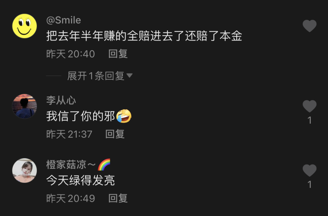最近看股市的段子也是很多,什么跌妈不认、韭零后……“逢高减仓”的视频发到抖音上,播放量快突破100万,评论也是大型韭菜申诉现场。