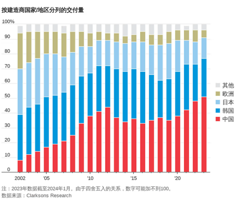 截至今年一月,我国的全球造船交付量占比,已经从2005年的17%,提升至51%;