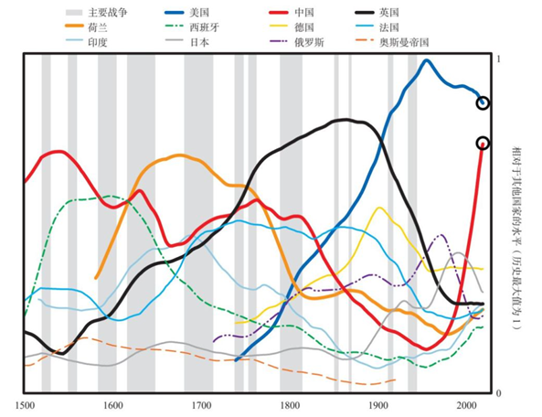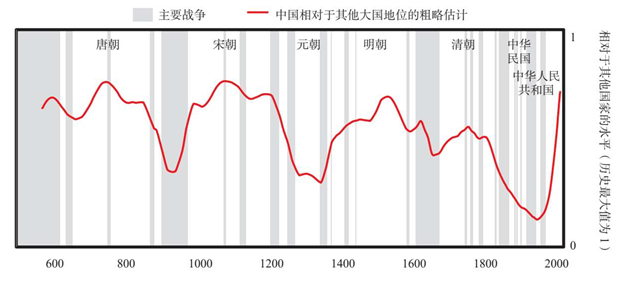 在横跨公元600年至今日,14个世纪的漫长时间轴上,中国屡屡屹立于世界强国之巅,彰显其深厚的文化底蕴。只有在大约1840—1950年是显著的例外,当时中国陷入急剧衰落。新中国建立后迎来了重建与复兴,其崛起之路虽初时步履蹒跚,却逐渐加速,直至如今展现出惊人的发展速度。
